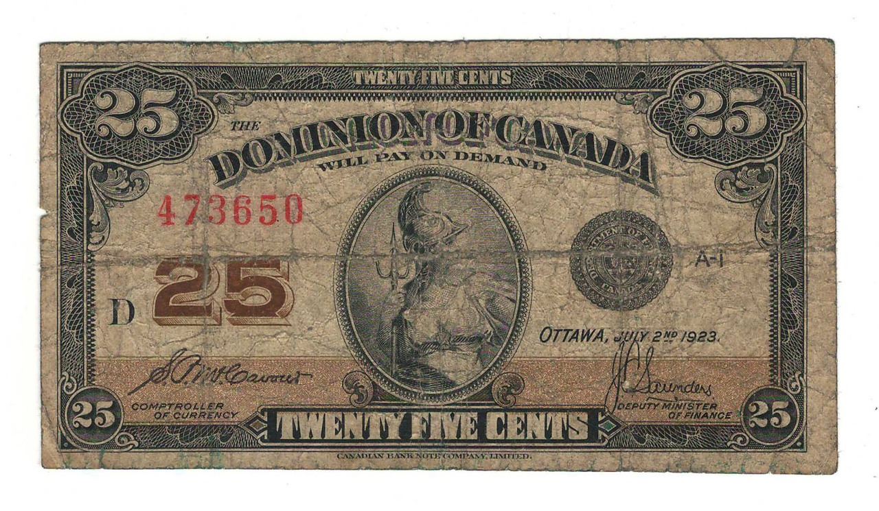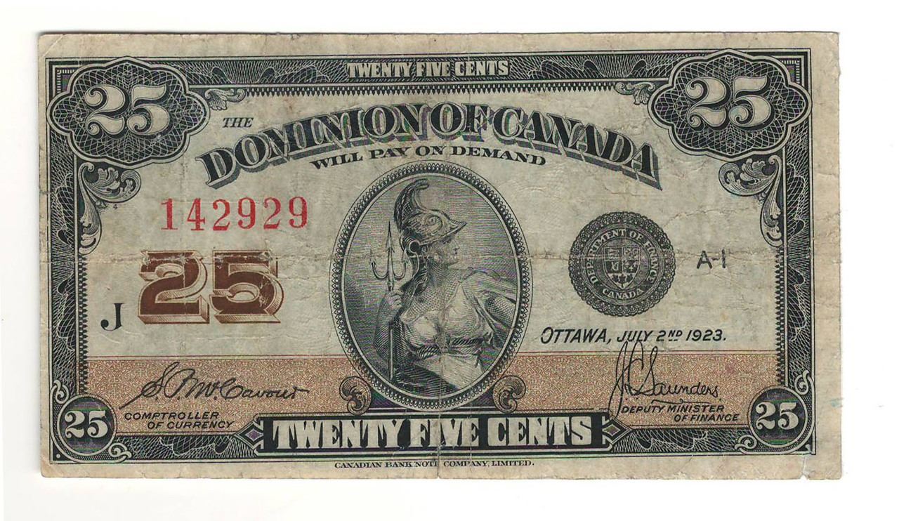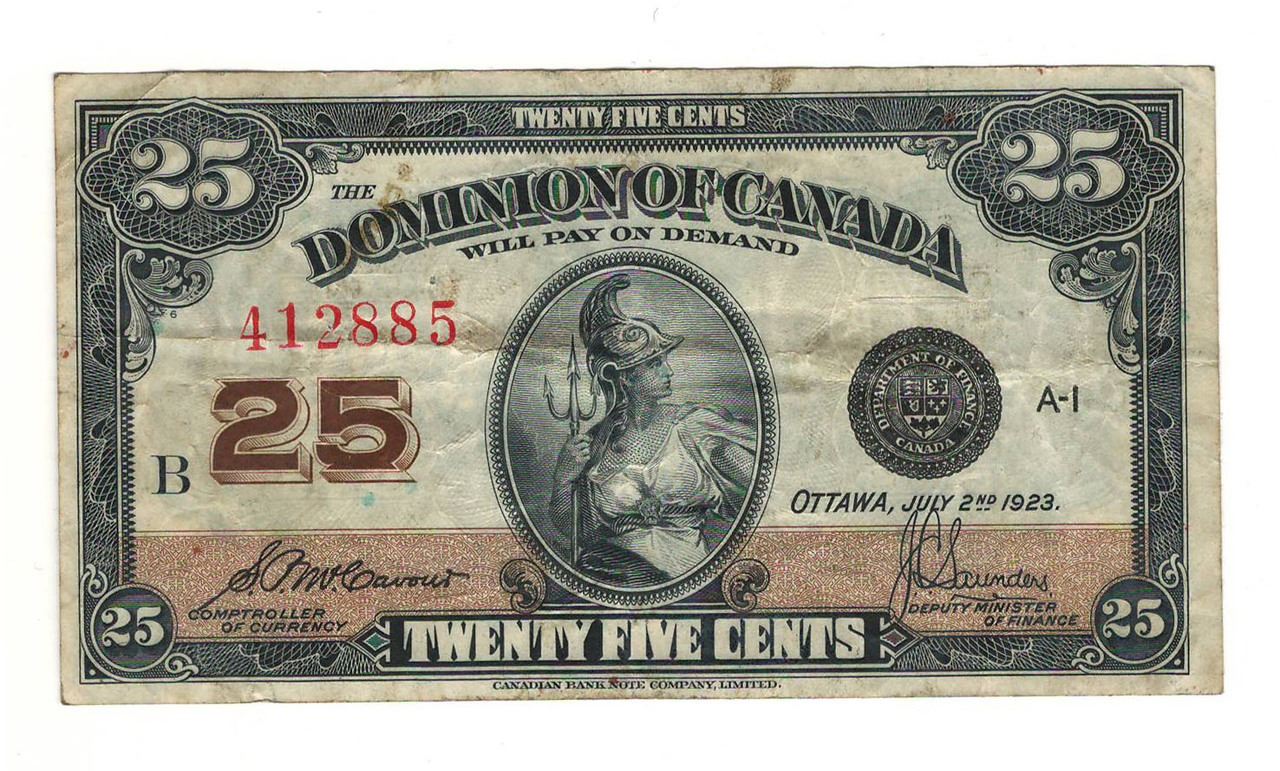 Other Canadian Paper Money; 22 Results. Best Match. Best Match; Time: ending soonest; Time: newly listed; Price + Shipping: lowest first;. 1923 DOMINION OF CANADA 25 CENTS BANKNOTE GRADED BCS VF35 - McCAVOUR/SAUNDERS. $72.89. or Best Offer. $7.25 shipping. 1923 Dominion of Canada $1 - DC-25i. CCCS F-12 - Bronze Seal.